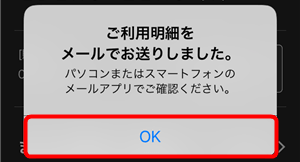 iPhone・iPadの場合は「ご利用明細をメールでお送りしました。」が表示されるので、そのまま『OK』をタップ。