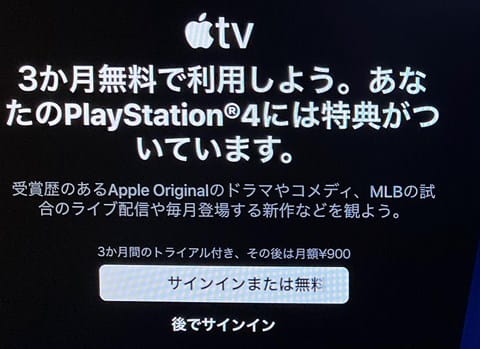Apple TV+に申し込みするときにPS4を持っている方は3ヶ月間無料で、PS5を持っている方は6ヶ月間無料になります。