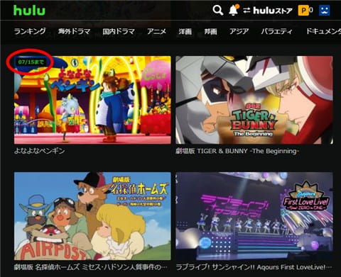 カテゴリごとのすべての作品が表示されるので、作品タイトル上に「日付」が表示されているのが、Huluで配信終了する作品です。