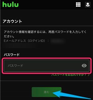 アカウント情報を確認するためにHuluの「パスワード」を入力して、『進む』をクリック。