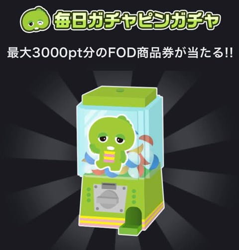 FODプレミアムでは最大3,000ポイント分のFOD商品券が当たる「毎日ガチャピンガチャ」を1日1回挑戦することができます。
