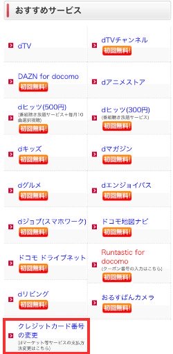 ドコモオンライン手続きに移動するので、おすすめサービスから「クレジットカード番号の変更」を選びます。
