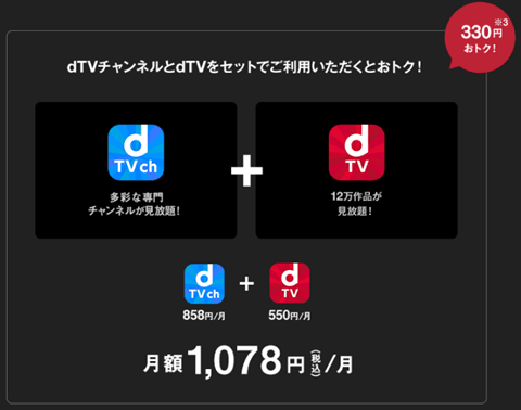 月額550円で12万作品が見放題の「dTV」と「dTVチャンネル」をセットで利用すると月額1,078円(税込)になるので、月ごとに330円得することになります。
