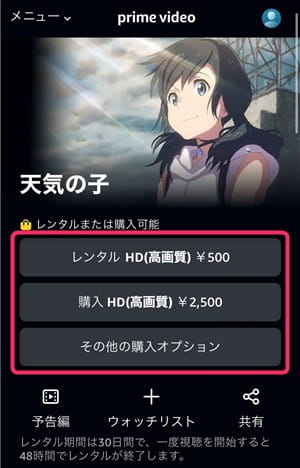 また、レンタルの作品詳細ページには「レンタルまたは購入可能」と表示されます。