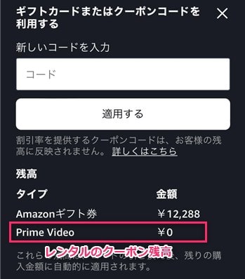 残高が表示されるので、その中の「Prime Video」がレンタルのクーポン残高になります。