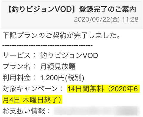 ちなみに、釣りビジョンVODの無料期間を忘れた方は、契約したときにメールで届く「登録完了のご案内」を確認してください。