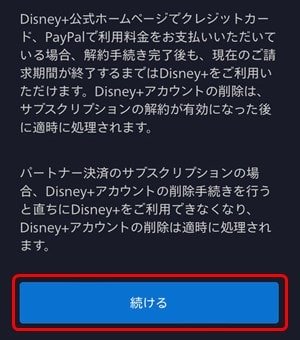 Disney+アカウント削除に関する確認・注意事項に目を通して、下にスクロールしていきます。