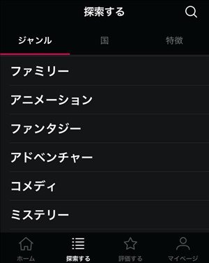 例えば「探索する」ではジャンル、国(製作国)、特徴から映画を探せるので、好きな作品や面白そうな作品がすぐ見つかります。