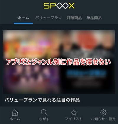 まず、アプリだと好きなジャンルの作品を確認したくても、SPOOX全体から探すことはできません(※WEBサイトなら検索可能)。