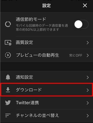 ダウンロードから「Wi-Fiのみ」をオン・オフにしたり、「ダウンロード画質」を中画質や高画質に変更できます。