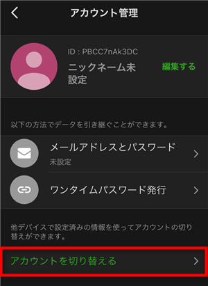 続けて、アカウント切り替えから「メールアドレスとパスワード」を選択。