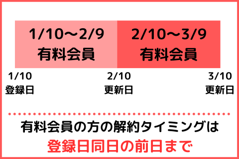 - 解約タイミングは無料期間は登録日から30日以内で、有料会員は登録日の前日まで
