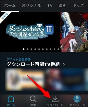 Amazonプライムビデオでダウンロードした動画をオフライン再生するには、アプリ画面下の「ダウンロード」をタップ。