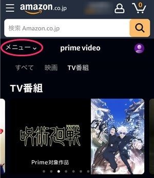 Amazonプライムビデオにアクセスして、ページ左上の「メニュー」をクリック。