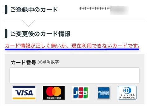 実際にデビットカードやプリペイドカードを入力してみたら、「カード情報が正しく無いか、現在利用できないカードです。」と表示されます。