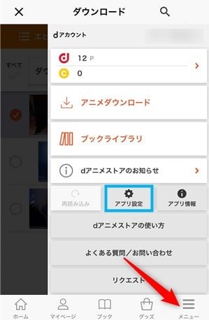 dアニメストアのダウンロード動画を一括削除するには、アプリの「メニュー」→「アプリ設定」を選びます。