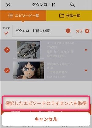 画面下から「選択したエピソードのライセンスを取得」を押せば、複数動画のダウンロード期限を48時間に戻してオフライン再生できます。