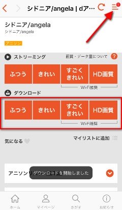 作品視聴ページのダウンロードから「ふつう」、「きれい」、「すごくきれい」、「HD画質」の画質を選択します。アニソンのダウンロードが開始されるので、画面右上の「アイコン」を押して下さい。