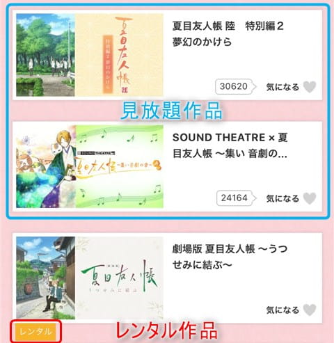 レンタル作品には左下に「レンタル」の表示がありますが、見放題作品にはなにも表示がないので、すぐに見分けが付きます。