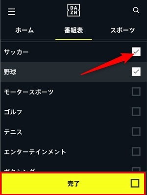 フィルターから確認したいスポーツにチェックを入れて「完了」を押すと、サッカー、野球、モータースポーツなどを絞り込んで表示できます。