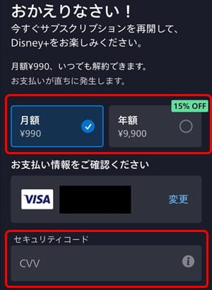 料金プランから「月額プラン」または「年額プラン」を選んで、クレジットカード決済の場合は「セキュリティコード」を入力。