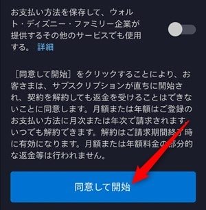 最後に「同意して開始」をクリックすれば、ディズニープラス解約後でも再開・再入会できます。