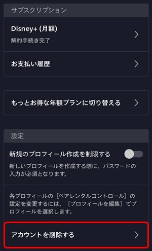 • ディズニープラスの退会はアカウント設定の「アカウントを削除する」からできる