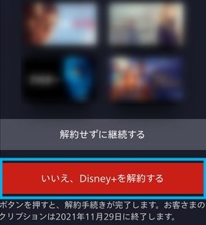 最後に確認画面が表示されるので、「いいえ、Disney+を解約する」を選択。