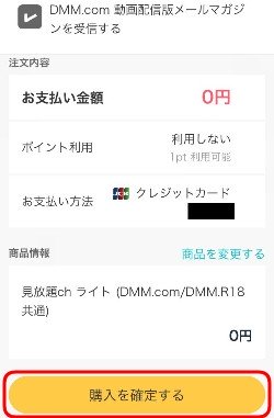 購入内容の確認になるのでお支払い金額、ポイント利用、お支払い方法、商品情報がDMM見放題chライトであることをチェックして、最後に「購入を確定する」を押してください。