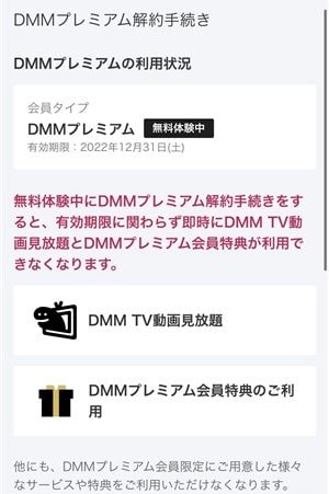 DMMプレミアムの解約手続きになるので、DMM TVや会員特典が利用できなくなることを確認します。