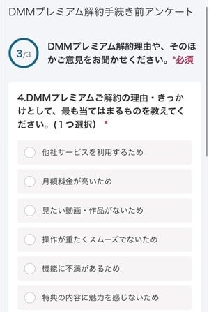 解約手続き前アンケートに移動するので、DMMプレミアムに関するアンケートにすべて回答します。