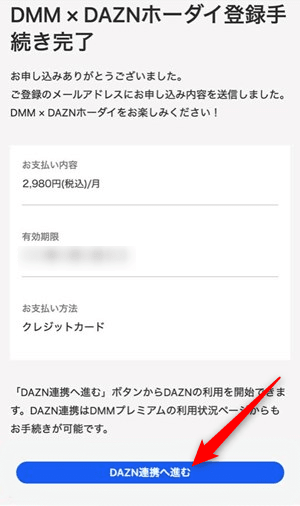 画面に「DMM×DAZNホーダイ登録手続き完了」と表示されたら、DMM×DAZNホーダイの登録・契約方法はすべて完了です。