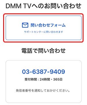 まず、DMM TVへのお問い合わせにアクセスして、「お問い合わせフォーム」を選択。