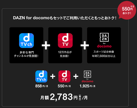スポーツ見放題の「DAZN for docomo」と「dTV」と「dTVチャンネル」をセットで利用すると、月額2,783円(税込)になるので、月ごとに550円得することになります。