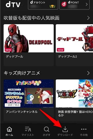 dTVでダウンロードした動画を削除するには、アプリ画面下の「ダウンロード」をタップ。