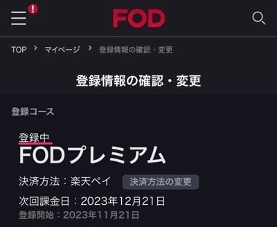 ※iTunes Store決済やGoogle Play課金の場合はFODプレミアムを解約しても「登録中」と表示されます。