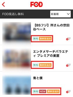 FOD見逃し無料の対象番組が一覧表示されるので、その中から見たい番組を選びます。ちなみに、対象番組には「無料」のアイコン表示があるのでわかりやすいです。