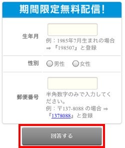 今度はアンケートが表示されるので、生年月、性別、郵便番号を入力して「回答する」を選択します(アンケートは初回のみですが、ブラウザのcookieを削除すると毎回アンケートに回答する必要があります)。
