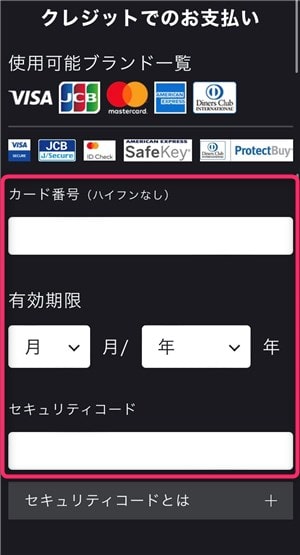 クレジットでのお支払いになるので、「カード番号」「有効期限」「セキュリティコード」を入力・選択。