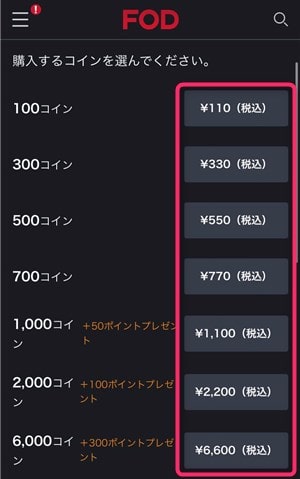 FODのコイン・ポイントが足りなくなったら、100~6,600円を選んで購入することができます。