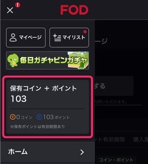 なお、FODポイントの有効期限を確認したい場合は「メニューアイコン(≡)」→「保有コイン・ポイント」からできます。