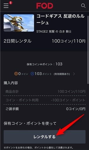 最後に購入内容を確認して、もう一度「レンタルする」をクリックすれば、FODコイン・ポイントで最新映画・人気番組をレンタルする方法は完了です。