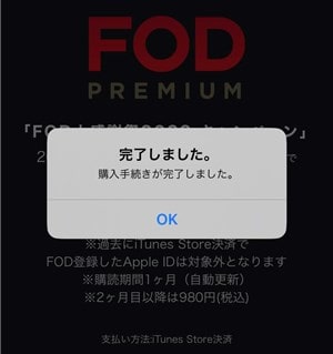 画面に「購入手続きが完了しました。」と表示されたら、FODアプリから登録・契約する方法は完了です。