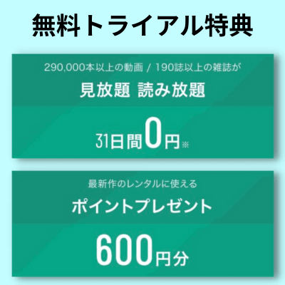 しかも、600円分のポイントがもらえるので、最新映画1本または新作マンガ1冊を無料で楽しめるので、かなりお得です。