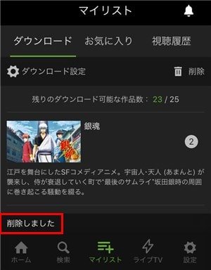 画面下に「削除しました」と表示されたら、Huluでダウンロードした動画を削除する方法は完了です。