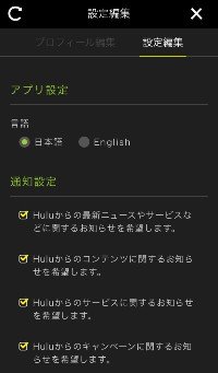 設定編集のアプリ設定で言語を日本語や英語に設定したり、通知設定でHuluの最新ニュースやお知らせを通知するか設定できます。