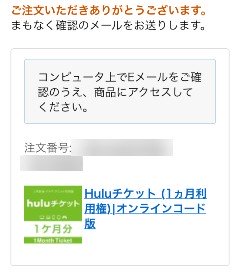 画面に「ご注文いただきありがとうございます。」と表示されたら、AmazonからHuluチケットを購入する方法は完了です。
