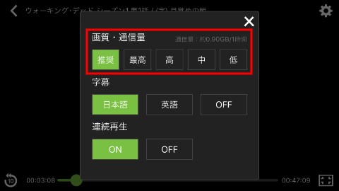 設定のウィンドウが表示されるので、画質・通信量を「低」に変更すると、Huluの通信量をかなり節約できます(初期設定は「推奨(自動)」になっています)。