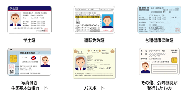 本人確認書類は学生証、運転免許証、各種健康保険証などがあります。