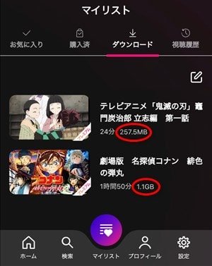 また、Leminoで既にダウンロードした動画はアプリの「マイリスト」→「ダウンロード」から作品ごとのダウンロード容量を確認できます。